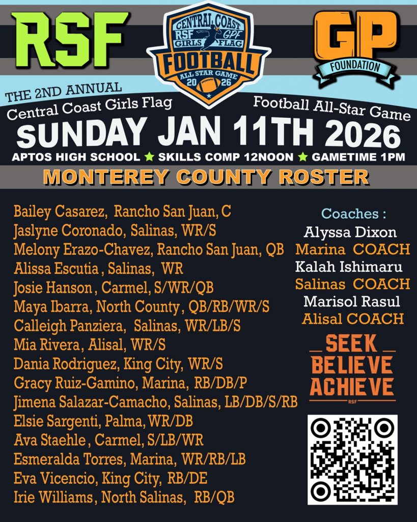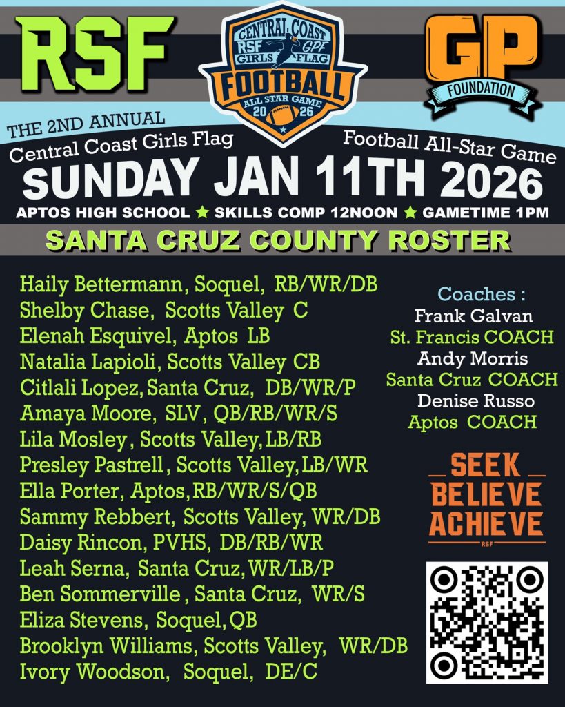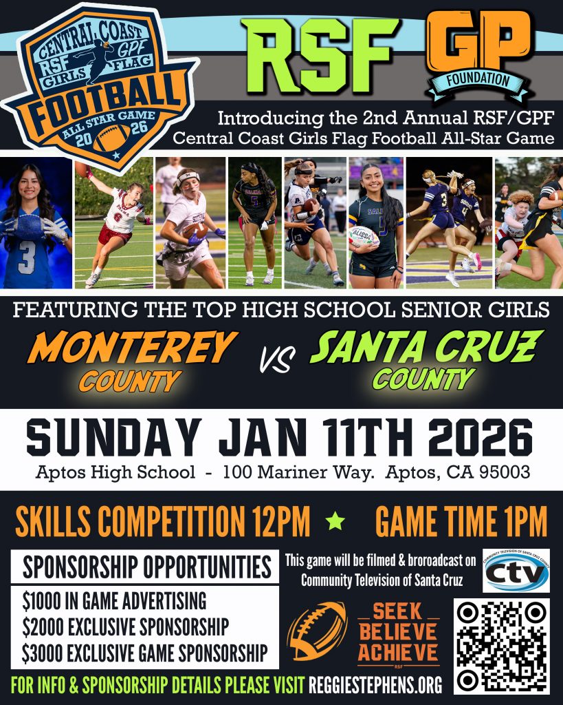 The inaugural RSF/GPF Central Coast Girls Flag Football All-Star Game was more than just a game—it was a moment in history. Held on January 26, 2025, at Santa Cruz High School, the event brought together the top senior athletes from Monterey and Santa Cruz counties, showcasing the growth and talent in a sport that’s quickly gaining momentum. The vision behind the game came from Reggie Stephens, founder of the Reggie Stephens Foundation (RSF), and Joel Domhoff of the Gino Panelli Foundation (GPF), who wanted to create something special for the young women carving out their place in football.